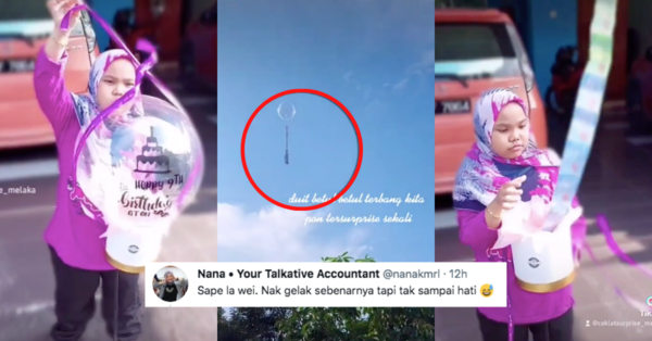 Apa yang lebih lucu lagi adalah apabila dia bertindak tidak sabar dan terus membuka reben di depan rumah. Sebaik saja reben dibuka, belon yang diikat bersama duit itu terbang ke atas. Kanak-kanak perempuan itu dilihat hendak mencapai duitnya namun tidak berjaya.