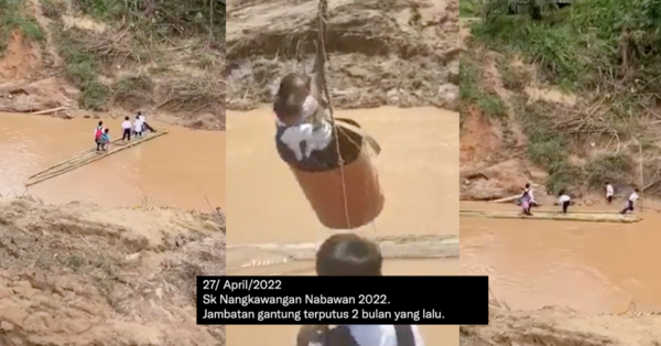 Selain itu, kelihatan dua orang pelajar menaiki pengangkutan seakan cable car untuk menyeberangi sungai yang deras itu.