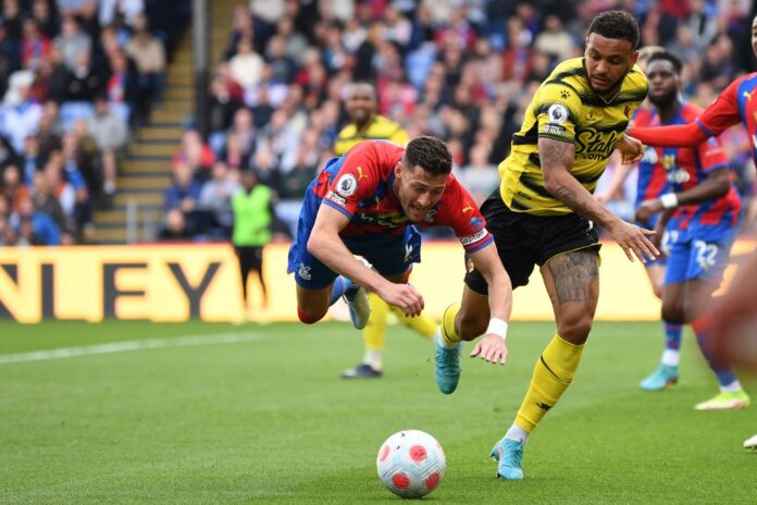 Crystal Palace’s English defender Joel Ward (left) vies with Watford’s Norwegian striker Joshua King during their English Premier League match at Selhurst Park in south London, May 7, 2022. — AFP pic