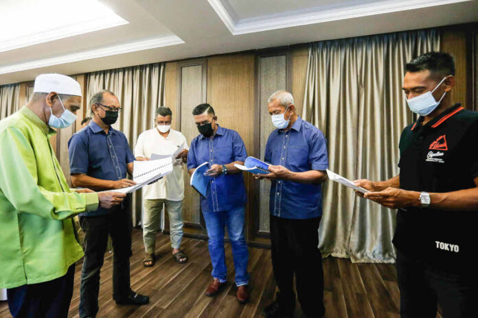 Penang Fishermen Association Chairman Hamadi Md Rodzi (second left) along with South Penang Fishermen Association Chairman Arshad Omar (second right) and few other Fishermen Association reviewing the Minute Meeting booklet at Pen Mutiara, October 13, 2021. — Picture by Sayuti Zainudin