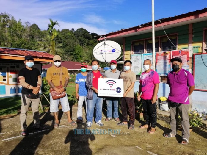 Koh (fourth left) and PSB members handing over the satellite broadband system to a representative of a school at Mujong in Baleh, Kapit.