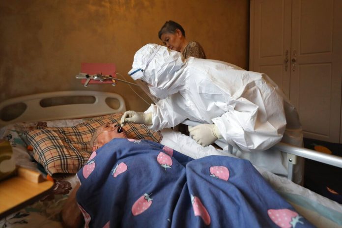 A medical worker takes a Covid-19 swab test from an elderly during home visits in Wuhan in May. (AP pic)