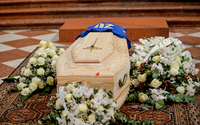 Paolo Rossi’s No 20 jersey is placed on his coffin during his funeral service in Italy on Saturday. (AP pic)